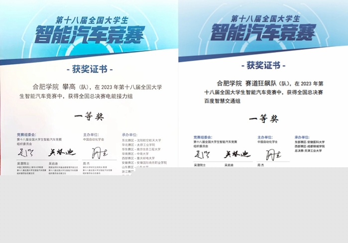 合肥學院智能車團隊于2007年10月成立,2008年首次參賽,在校領導、各部門的大力支持下,在先進制造工程學院黨政領導的指導下,形成了“堅持拼搏、團結奉獻”的良好氛圍,自參賽以來,400余名學生獲省級以上獎勵,團隊獲省級以上獎項174項,其中國家一等獎7項、二等獎20項、三等獎3項、省級一等獎55項。以賽促教,參加該項賽事提升了我校學生的動手能力和創新能力,充分體現了學校應用型辦學理念在學生工程實踐能力、創新意識、綜合素質等方面的培養成果。