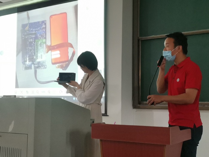 李炎陽現場展示了設計作品的原型。他指出,本次專項賽作品征集主題為“液晶顯示模組展示裝置造型設計”,主要針對手機屏幕和平板電腦屏幕兩款液晶顯示模板組DEMO的展示設計作品征集。目前展品載體材質單一、形式單一,希望參賽者發揮專業所學,進行頭腦風暴,設計出更新穎、更具科技感、智能化的產品。他建議參賽者要緊密圍繞專項賽主題,秉承著“創意性、引領性、實用性兼顧市場推廣價值”的理念進行作品設計。活動中,李炎陽還與主持人一同解答了在場師生的提問。