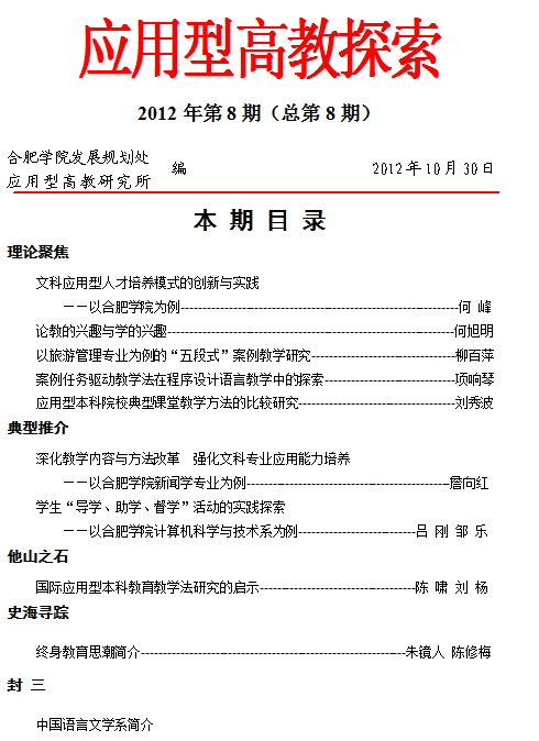 為進(jìn)一步深化教學(xué)改革,不斷提高人才培養(yǎng)質(zhì)量,應(yīng)用型高教探索8 期以教學(xué)方法改革為主題組稿,目錄如下,具體內(nèi)容請(qǐng)查閱發(fā)展規(guī)劃處網(wǎng)站(http://www.quwg.xyz/fgc/),并將您的寶貴意見(jiàn)或建議反饋至我處。