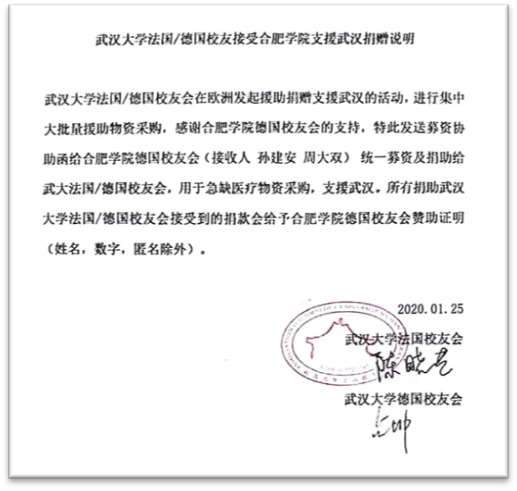 Von dem deutschen Alumni-Verband der Universit?t Wuhan und dem franz?sischen Alumni-Verband der Universit?t Wuhan wurde am 25.Januar 2020 die oben abgebildete Nachricht ver?ffentlicht:?Wir bedanken uns beim Alumni-Verband der Universit?t Hefei für die Unterstützung.”