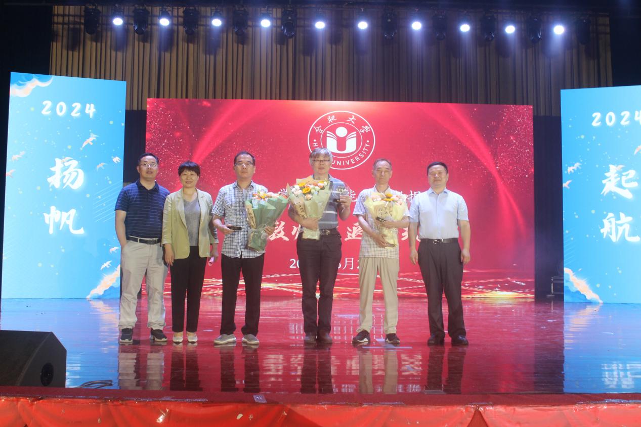緊接著,“經(jīng)年”篇章帶領大家回顧了那些與學校、老師和同學們共同度過的美好時光。歌曲《手寫的從前》、朗誦《彼方尚有榮光》等節(jié)目緩緩拉開了教師榮退儀式,書記牛欣、院長余海峰、副院長陳圣兵為退休教師張家銳、劉壽春、陳效軍頒發(fā)紀念章,牛欣書記為我們重新“備份”了三位退休教師的“數(shù)據(jù)集”,娓娓道來每一位老師孜孜不倦、默默奉獻的治學精神,她表示老教師們不僅傳授了知識,更傳遞了責任、激情和愛心,在教育教學、科研創(chuàng)新、社會服務等方面所做出的貢獻,已經(jīng)深深地烙印在學院的成長史上,也將永遠銘記在學生們的心中。隨后張家銳老師用一首詩詞《感遇》送別畢業(yè)生,字里行間無不彰顯了教育工作者們的無私奉獻以及對學子們的深深期許,將晚會推向了又一波高潮。