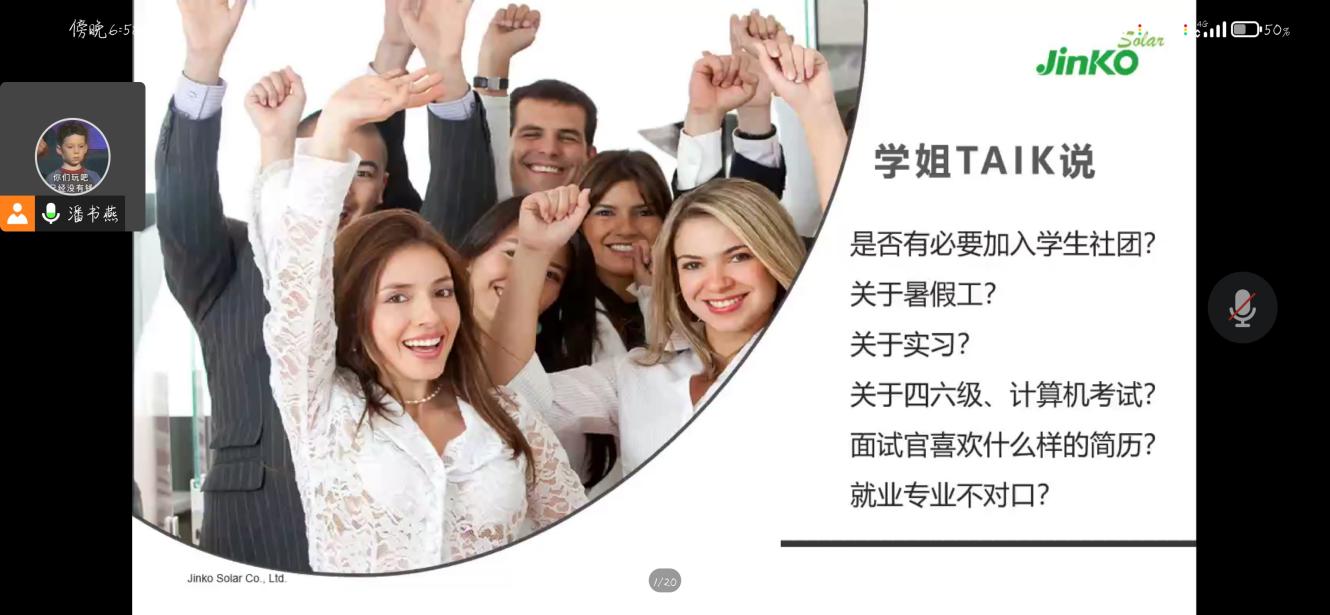 為拓展學生知識面,提高學生對職業規劃重要性的理解,進一步提升學生們對自己職業生涯的規劃意識。12月13日晚,先進制造工程學院利用騰訊會議平臺線上組織企業HR高管進課堂開展職業生涯規劃活動,特邀安徽晶科能源有限公司招聘主管潘書燕來宣講,院黨委書記杜娟、副書記蔡靈美、就業聯絡員張傲以及部分大一學生全程參加本次活動。