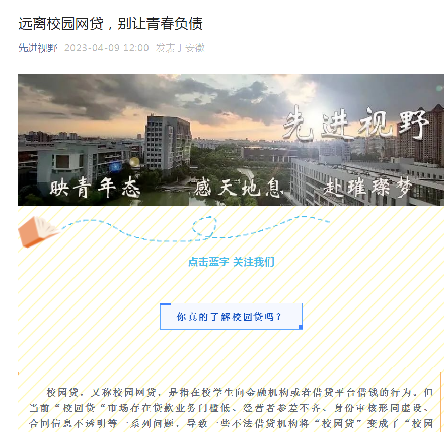 高校官方微信公眾平臺是高校全媒體矩陣中的重要組成部分,是高校對外宣傳的重要窗口,也是高校品牌和形象塑造的重要平臺。我院通過先進視野公眾號發布專題文章“遠離校園網貸,別讓青春負債”,圍繞校園貸的定義、特點、危害、案例、防范等方面開展教育。全篇文章以圖文并茂的形式向學生進行宣傳教育,獲得了學生的喜愛。