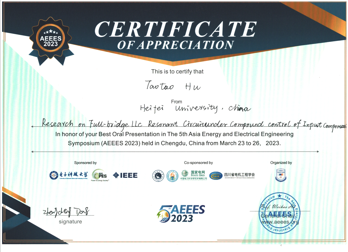 2023年3月23-26日,第五屆亞洲能源與電氣工程國際會議(The 5th Asia Energy and Electrical Engineering Symposium, AEEES 2023)在中國成都舉行。先進制造工程學院徐海珍副教授指導的2020級碩士研究生胡濤濤參與了本次會議,并在現代電力電子與傳動專題分會中進行了《Research on Full-bridge LLC Resonant Circuit under Compound control of Input Compensation》口頭報告,榮獲最佳口頭報告獎(Best Oral Presentation)。