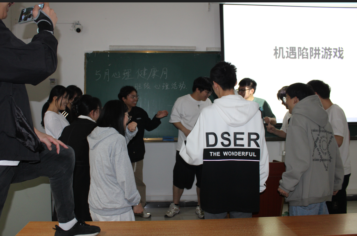 “團結協作,放飛自我”活動中,共兩個環節,活動預熱階段同學們開展了“松鼠和大樹”活動。同學們三人一組。二人扮大樹,面對對方,伸出雙手搭成一個圓圈;一人扮松鼠,并站在圓圈中間。主持人喊“松鼠”,大樹不動,扮演“松鼠”的人就必須離開原來的大樹,重新選擇其他的大樹。主持人喊“大樹”,松鼠不動,扮演“大樹”的人就必須離開原先的同伴重新組合成一對大樹,并圈住松鼠。下一個活動為:“機遇和陷阱”,同學們左手掌心向下,右手伸出一食指,使每人的左手掌心正對著左邊同學的食指,右手食指戳著右邊同學的掌心。每位同學左手掌下面的就是“機遇”,而右手食指面臨著落入“陷阱”的可能。主持人講一個故事,故事里出現“心”字,大家就要快速抓住“機遇”逃離“陷阱”。活動提升了同學們的合作能力,增強了團隊意識。