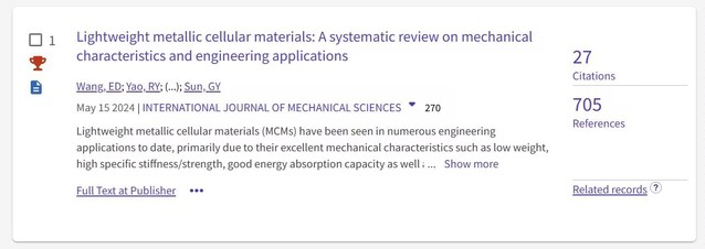 根據科睿唯安(Clarivate Analytics)公布的20247ESI最新數據, 我校先進制造工程學院青年教師王二冬2024以合肥大學為第一單位在《International Journal of Mechanical Sciences期刊上發表的長篇綜述論文Lightweight metallic cellular materials: A systematic review on mechanical characteristics and engineering applications(Volume 270, May 2024)成功遴選為ESI高被引論文。目前Web of Science數據庫顯示該文獻已經被引用27次。《International Journal of Mechanical Sciences》雜志是機械工程/力學領域國際權威期刊 (中科院一區Top影響因子:7.1),這是我校機械領域首篇以第一單位入選為ESI全球前1%高被引論文,是我校學科建設取得重要的科學研究成果。