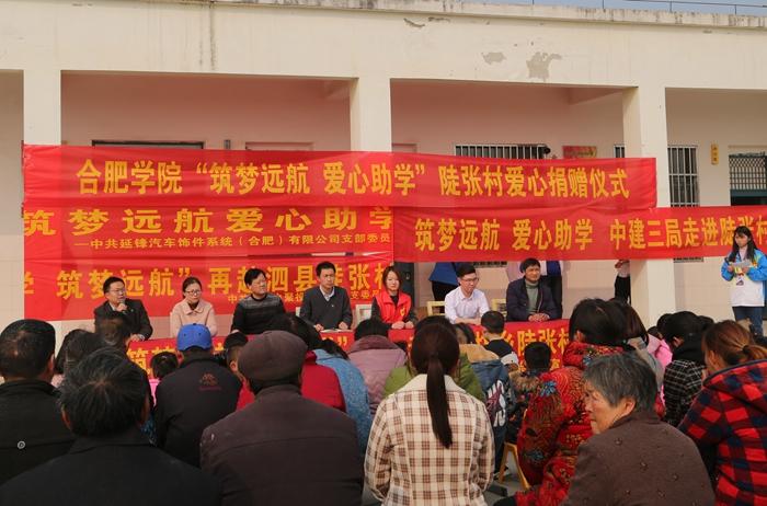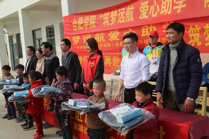 在團委齊俊老師帶領下志愿者們與始信居委會黨總支書記李正保以及轄區負責人一行前往陡張村。在校駐村干部朱世群老師的帶領下,捐贈儀式在陡張村聯合小學順利開展。李正保表示,此次活動非常有意義,通過校地聯動,愛心幫扶,使陡張村村民生活狀況有了很好的改善,希望今后加強雙方的志愿合作,祝愿合肥學院培養更多的學子為國家社會發展做出更大建設。青年志愿者學生代表閆順匯報了“筑夢遠航  愛心助學”陡張村幫扶活動近幾年開展以來取得的良好成效。大家為現場參與儀式的留守兒童和貧困學子分別發放了愛心物資,孩子們領到書包、學習用品都喜笑顏開,喜悅之情溢于言表。