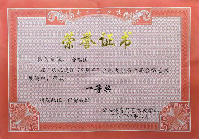 6月20日晚,在合肥大學圖書館報告廳A廳舉辦的“慶祝建國75周年”合肥大學第十屆合唱藝術(shù)展演活動成功開展,曹紅星老師指導的教育學院合唱團,由合唱團隊長劉洋陽指揮,憑借精湛的演唱技巧,以《時間都去哪了》和《今天是你的生日》兩首歌曲獲得合唱比賽一等獎。