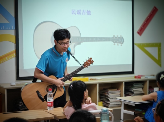 7月4日下午,合肥學院教育學院“七彩童年,‘育’你相伴”志愿團隊前往合肥市包河區濱湖和園社區開展“三下鄉”社會實踐活動。李碩碩、沈葉天兩位志愿者共同將音樂帶進社區,為孩子們帶來了一節生動的吉他教學課。課程的主要目的是讓孩子們在了解有關吉他樂理知識的同時,培養他們對音樂的興趣,陶冶情操。 有這樣一種樂器,不管是在茶余飯后的家庭音樂會,還是在學校操場的草坪上,人們都能隨時隨地和它一起彈唱,這種樂器就是吉他。吉他的和弦是夏日的浪漫,迎著午后炙熱的陽光,志愿者將孩子們迎進教室。上課前,志愿者的手指輕彈琴弦,為孩子們彈奏了本節課要學習的歌曲——《小星星》,跳動的音符如精靈一般,在空中翩翩起舞。孩子們都聽得如癡如醉,迫不及待地想要了解有關吉他的知識。課程開始后,志愿者先簡單介紹了吉他,并教孩子們如何去區分三種不同類型的吉他。緊接著,志愿者通過圖片展示的方式,帶領孩子們了解吉他的結構、功能及其演奏姿勢。為了讓孩子們更直觀地感受到音樂的魅力,志愿者讓孩子們自己動手彈奏吉他,并在一旁耐心地給孩子們傳授彈奏的技巧,細心地糾正他們的錯誤。在志愿者的指導下,許多孩子都可以簡單地彈奏一些音符。在課程的最后,兩位志愿者和孩子們一起隨著吉他的伴奏,合唱了三首耳熟能詳的兒歌:《小星星》、《粉刷匠》、《兩只老虎》。“一閃一閃亮晶晶,滿天都是小星星。”在教室里,孩子們稚嫩的歌聲和志愿者的領唱聲交織,一同譜寫出屬于這個夏天的悠揚樂章。志愿者們用音樂走進孩子們的內心,讓他們在音樂中享受童年的快樂。