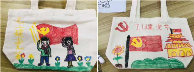 最后一個環(huán)節(jié)是手工繪制帆布袋,通過紅色故事和紅色歌曲,小朋友可以在帆布袋上繪制他們想象的畫面,學(xué)生黨員積極協(xié)助小朋友完成紅色主題的繪畫,鮮艷的黨旗飄揚在一幅幅帆布袋上。活動最后,支部黨員與小朋友們一起合影留念。