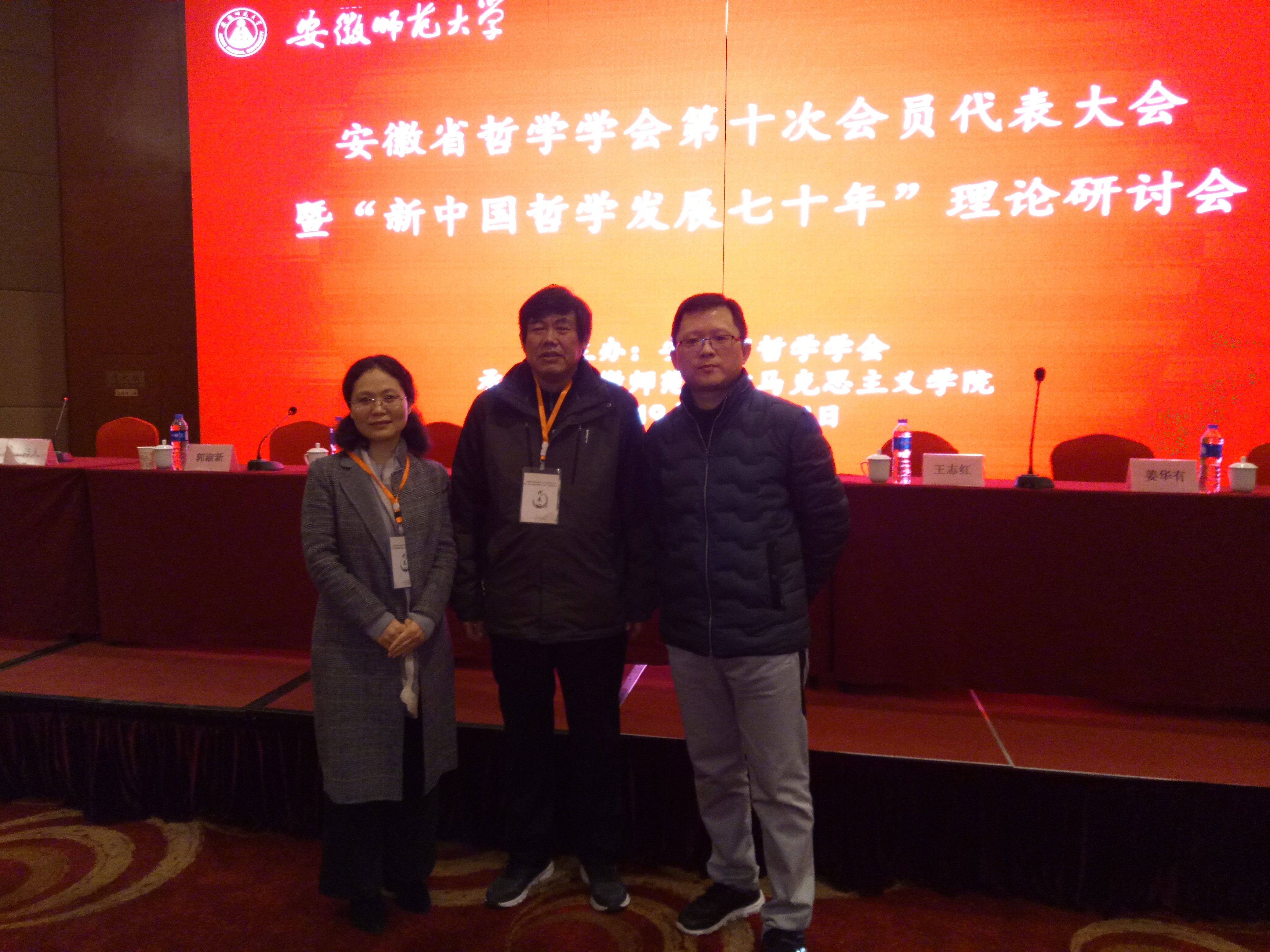 2019年12月7日至8日,安徽省哲學學會第十次會員代表大會暨“新中國哲學發展七十年”理論研討會在安徽師范大學順利召開。本次會議由安徽省哲學學會主辦,安徽師范大學馬克思主義學院承辦。來自全省各高校、黨校和科研院所的120多位專家學者參加了會議,我校馬克思主義學院蘇冰、李繼友、魏亞三位老師參加了會議。蘇冰老師以《話語權的視角下習近平對外話語體系構建的三個維度》為題作了大會發言,并獲優秀論文獎。