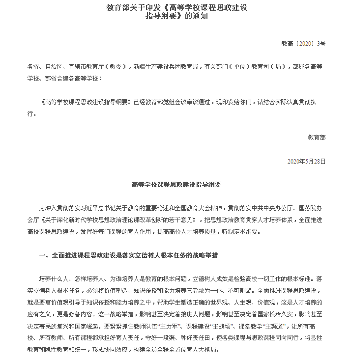 教育部關于印發《高等學校課程思政建設指導綱要》的通知(教高〔2020〕3號)