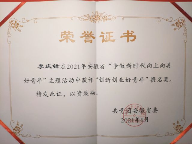 近日,共青團安徽省委員會公布了2021年安徽省“爭做新時代向上向善好青年”評選結果,我校經濟與管理學院2018級物流管理專業李慶鋒同學榮獲“創新創業好青年”提名獎。