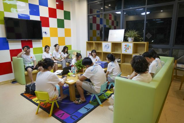 晚上七點半,“七彩假期”志愿服務隊成員于新時代文明實踐站青少年活動室舉行第一次全體例會。會上,志愿服務隊隊長汪欣楠就了解到的村內實際情況進行總結,安排隊員對第二天的教學情況安排進行討論,確定了具體的教學安排。