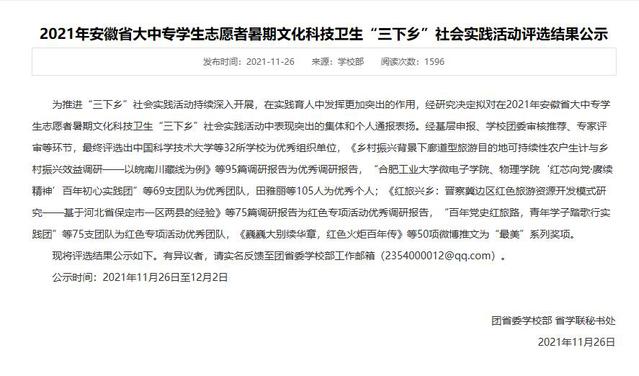 近日,安徽省大中專學(xué)生志愿者暑期文化科技衛(wèi)生“三下鄉(xiāng)”社會(huì)實(shí)踐活動(dòng)評選結(jié)果公示,我校獲評多項(xiàng)獎(jiǎng)項(xiàng),其中優(yōu)秀團(tuán)隊(duì)2支,優(yōu)秀調(diào)研報(bào)告4篇,優(yōu)秀個(gè)人2名,在長三角高校大學(xué)生重走革命路專項(xiàng)中獲得最美日記1篇。我校榮獲優(yōu)秀組織單位稱號。