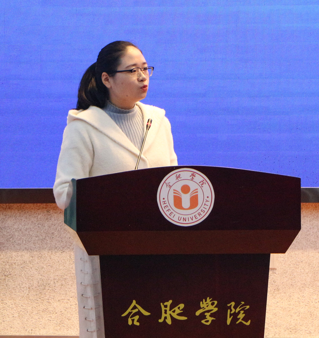 高大明宣讀了合肥學院第九屆“挑戰杯”大學生課外學術科技作品競賽表彰文件。與會領導為優秀組織獎獲獎單位、優秀指導老師代表、優秀團隊代表頒發了獎牌和證書。優秀指導老師劉婧和學生代表周子健發言,他們分別以“同心協力、不怕困難、精益求精”和“好的選題是成功的一半”為關鍵詞,分享了參加“挑戰杯”比賽的所想、所感和所獲。