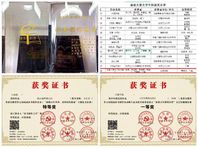在讀書創作活動中,王欣悅同學被評為“讀書創作之星”,她的作品《漫山遍野映山紅》獲特等獎;在“謳歌百年輝煌歷程”文藝短視頻比賽中,李慶鋒同學的沙畫《百年輝煌歷程》獲得一等獎;在第五屆安徽省大學生主題演講比賽中,張遠想同學獲得本科組一等獎(第二名);在第三屆中華經典誦寫講大賽安徽省預選賽中,張昊、張佳駱、張瀚程等同學的作品《月光下的中國》獲一等獎。魯世秀、毛紅星、丁婧等五位老師獲評“優秀指導老師”,我校分別獲得第五屆安徽省大學生主題演講比賽、第三屆中華經典誦寫講大賽安徽省預選賽和讀書創作活動三個比賽的優秀組織獎。眾多獎項的獲得是我校校園文化建設的優秀成果之一,體現了我校師生優秀的人文素養和綜合素質。