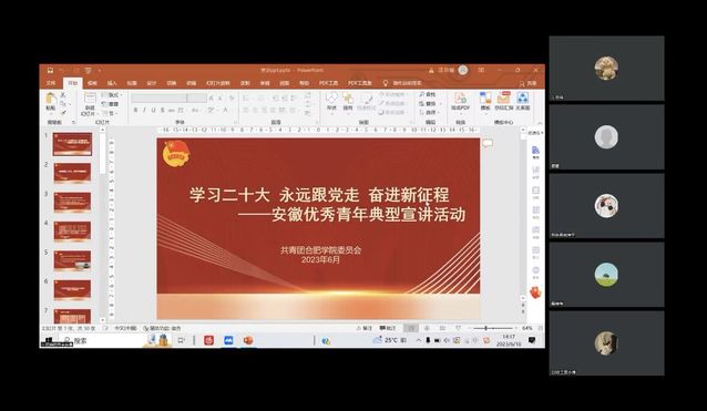 為充分發揮青年典型模范帶頭作用,進一步營造學習黨的二十大精神的濃厚氛圍,6月17日、18日,我校舉行“學習二十大 永遠跟黨走 奮進新征程”——安徽優秀青年典型宣講活動。本次宣講采取線上線下相結合的模式,分兩次開展,由2021年度安徽省優秀共青團員汪欣楠擔任主講人。共計290名學生到現場觀看,2400余名學生進行網絡收看,活動覆蓋103個團支部。