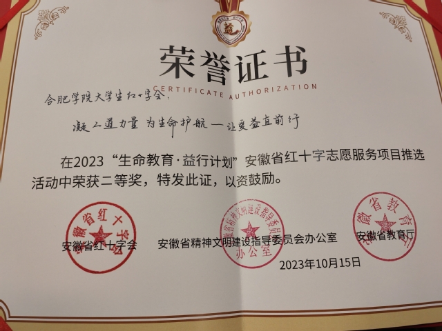 10月13日至15日,由安徽省紅十字會、省文明辦、省教育廳、省民政辦主辦的2023年“生命教育·益行計劃”紅十字志愿服務項目推選活動決賽路演在合肥圓滿落幕,我校大學生紅十字會參選項目“凝人道力量,為生命護航——讓愛益直前行”榮獲二等獎。