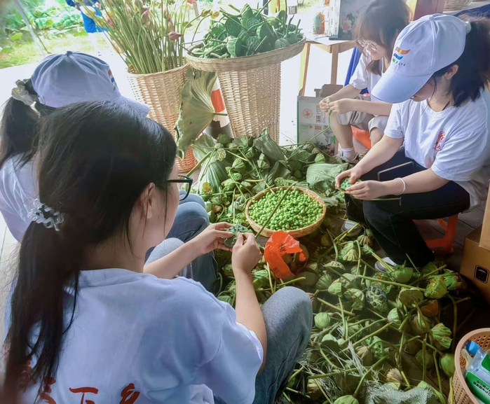 76日,“城韻建諧,暑夢新坊”實踐團隊前往豐樂鎮蔣崗村萬畝荷塘基地,與當地農戶一起體驗了蓮子手工制作方法,下蓮塘、摘蓮蓬、剝蓮子,了解養殖荷花的銷售渠道與經銷方式。團隊成員結合實際情況給萬畝荷花池烏篷船水渠改造和文化展館建設提供設計方案,并表示可以搭建相關銷售平臺幫助宣傳和推廣荷花系列產品,用電商平臺賦能鄉村振興高質量發展。