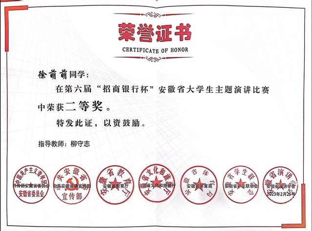近日,第六屆“招商銀行杯”安徽省大學生主題演講決賽在我校舉行,語言文化與傳媒學院徐萌萌同學經過激烈角逐,榮獲本科組二等獎,學院老師柳守志獲優秀指導老師稱號。
